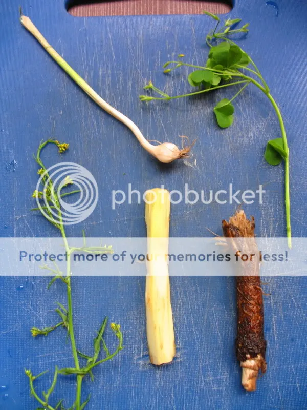 clockwise from top left: wild garlic, wood sorrel, burdock root (or gobo), second-year burdock stem, hedge mustard