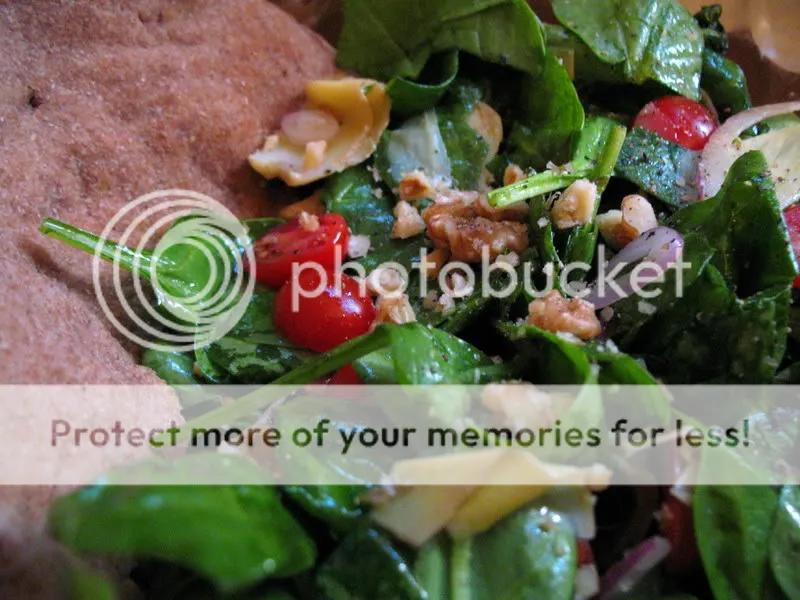 Three brownie points: It hinges largely on the marinated artichokes you buy pre-marinated. It just occurred to me since that I don’t use bottled salad dressings, this artichoke marinade solution may seem a bit more magical to me than for most — after all, it has a good deal of the stuff you’ll see in bottled dressings, and hopefully nothing more caustic than citric acid. But happily unprocessed raw spinach, tomatoes and walnuts more than make up for its flaws.
