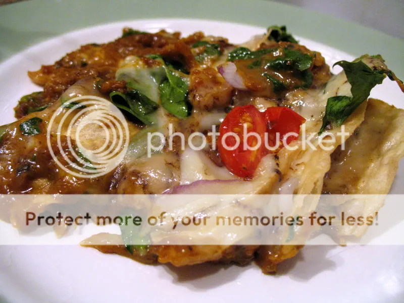 Seven brownie points: Not your average light summer meal. Nothing about chilaquiles — from the fried corn tortillas to the more-than-a-lot-of-cheese usage — is particularly light, with the exception of perhaps shredded slivers of lean chicken or another meat. I tried to compensate by adding some fresh spinach, which withered and cooked gently with all the oils surrounding it.