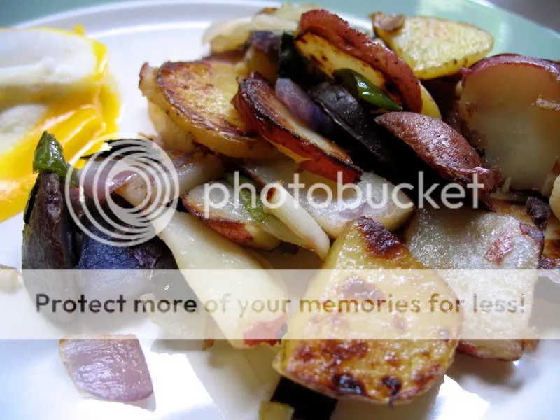 A true hash, by definition, could include meats and anything that your heart desires in it, scrappled into one pan. I encourage you to use your own judgement and pick out whatever you like in yours. I just have one technique, really, to share, which hinges on the fact that potatoes must be cooked longer than anything else that would likely populate your vegetable scrapple — peppers, onions, zucchini, especially garlic, and whathaveyou. Therefore, I treat them with a process that is somewhere in between blanching them and boiling them first. Bloiling? Whatever you call it, it turns out perfect results each time, and makes cooking this breakfast hash much faster. Which is good, because I’m always really hungry in the morning. Always.
