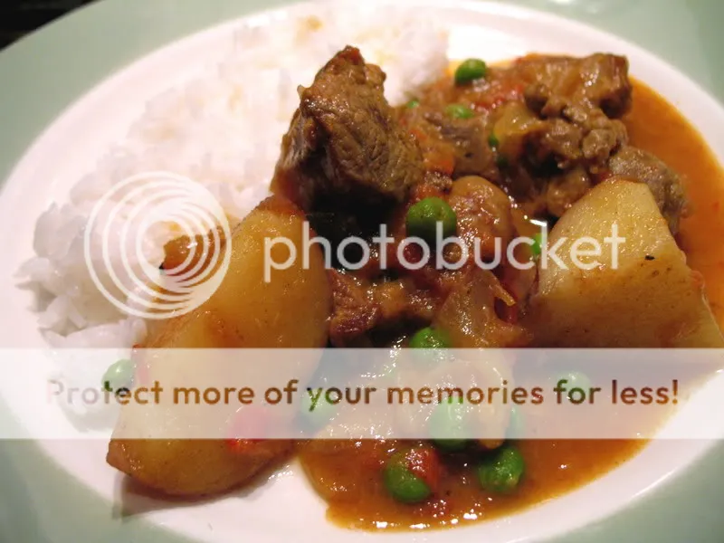 Stir curry and add the potatoes. Simmer covered for another 15 minutes. Leave cover partially opened and cook for 15 minutes more. Taste for seasoning. If curry is still too soupy, cook uncovered over medium heat until the sauce reduces to desired consistency. Add the peas at the last minute of cooking (if using another vegetable that requires a little more softening, add sooner). Serve alongside steamed rice.