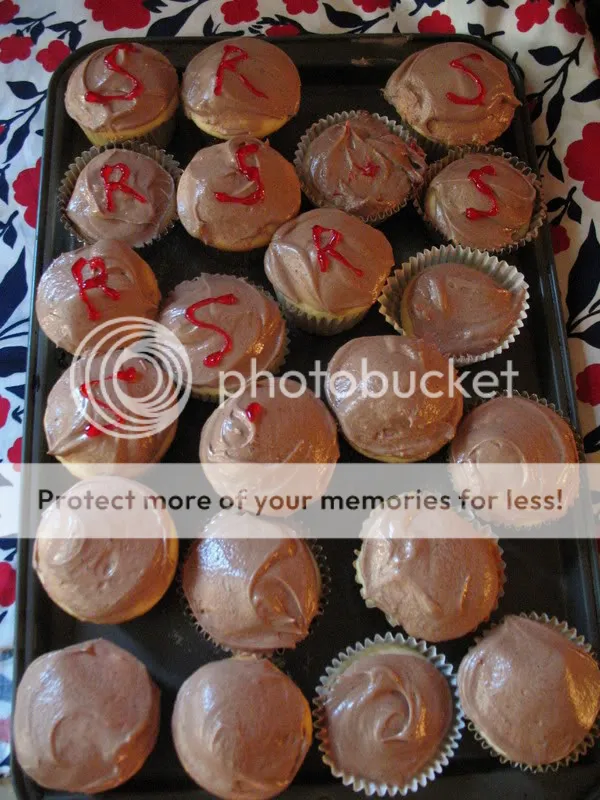 Dessert making is no longer my natural enemy. We’ve made amends. We’ve had some good times together. We’ve both grown up a little together. It’s a beautiful thing. But cake decorating… now that’s another story. It has proven to be a much more persistent foe. Case scenario: To give my cupcakes true birthday flair, I pulled out the old-fashioned tube ‘o red goo. I suppose I could have whipped up a batch of contrasting-hued buttercream and piped it through a Ziploc bag instead — actually, that would have been smart. Anyway, my intent was to decorate on these cupcakes alternating big fat “R”s and “S”s for the birthday couple’s names. Yet as infantile as this task’s degree of difficulty (and creativity) may sound, it managed to push this entry dangerously close the “disasters” category.