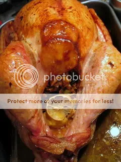 I admit I was a little intimidated taking on this beast for my first roast turkey. Not that you can tell from the picture, but this was an organic, free-range, hormone-free bird that my friend was able to order wholesale through the Brooklyn restaurant where he works. Now, after tasting this type of turkey roasted or the first time, I’m going to have to say that this whole new fad about brining your turkey the night beforehand is horse manure, invented by the people who are sucking the natural juices out of turkeys by raising them in the conventional, pesticide-ridden juggernaut. This was just one fine-tasting bird. Moist. I didn’t do anything fancy to it, save for a couple of lemon wedges tucked under its skin.