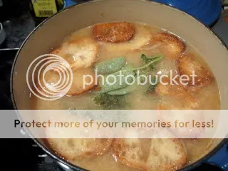 Toast the slices of bread until golden brown.In a large heavy-bottomed pot or Dutch oven, melt 1 tablespoon of the butter. Add the sliced onions and cook, stirring, on medium high for about 5 minutes. Turn heat to low and let the onions caramelize, stirring occasionally, for 30 minutes. Reduce heat if onions begin to brown. Add the thyme sprigs, sage leaves (or tie them together with kitchen twine to create a bouquet garni), toasted bread, roasted garlic cloves (hulls removed) and chicken stock. Cover and simmer for 30 minutes.