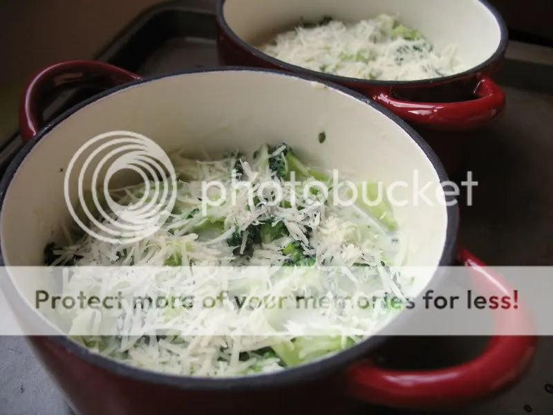 These oven-to-table cookware pieces are quite popular these days, but they leave me wondering what more can be done with their lids other than just keeping finished dishes warm. Defaulting to the meager ingredients I had on hand, I made these individual broccoli gratins using raw, fresh broccoli baked in a Pecorino Romano beschamel sauce and topped with more cheese. In the oven they went, covered, for 20 minutes; off came the tops, and 5-10 minutes later they were done. It was probably the most efficient way to cook broccoli (and its stems — I love the stems) to crisp-tenderness while retaining all its nutritional value aside from steaming. Plus, it soaked in all the creamy flavors of the sauce instead of just steam. Love it.