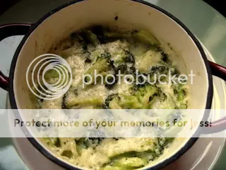 Three brownie points: The perfect compromise between hearty and cheesy and crisp and veggie-riffic. (Or a cream of broccoli soup without all the cream.) By starting out with raw broccoli, you keep all its vitamins in the dish — not in the water that you’ve blanched it with. In addition, there’s calcium from the cupful of cream, and a little fat from the cheese and butter, but that’s to be expected with anything titled a “gratin.” I opted for the strong, sharp Romano cheese because it seems to pack more condensed flavor per bite than its relative, Parmesan — thus requiring less.