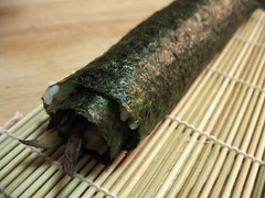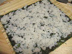 It’s not a very clever recipe after that in terms of Obama-ness. According to WikiAnswers, Obama’s favorite food is Chicago pizza, so I guess I’m way off the mark here. The man could hate sushi for all I know. But at least eggplant and spinach are Italian cuisine-friendly components. In all honesty, I’ve been itching to make sushi and maki for a while. In the last couple of months, I purchased a book, a rolling mat, sushi rice, sushi vinegar and nori, but haven’t had the time to put it all together. I took things step by step, spending one week to read up on the finer points of mixing the rice, and so on. I think this slow, measured progress is sort of Obama-like in his state victories. And to parallel his critics’ concerns, I happen to be very inexperienced at maki-making.