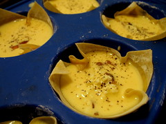 So that makes egg wonton skins a good substitute for, say, making ravioli, or freshly pinched tortellini. Not quiche. Quiche must by nature have a buttery, flaky crust no thinner than a slab of cardboard. I see this point, having been there once myself. I was actually quite disappointed with my mini quiche creation when I first made them, the night of my housewarming party. The bottom crust, sheathing the filling, was almost unnoticeable and blended in with the baked egg mixture, while the top corners above its surface were uncannily crispy. But then, after eating crispy bite-cradling custardy egg filling after another, I actually began to crave it. (I’ve been eating leftovers from the party ever since, and had enough unused egg and cream mixture that I made a batch of mini quiches just for myself again. And then, again.) Now, I can’t get the sensation out of my mind. I want to go home in the middle of the workday just to experience it again, fresh out of the oven. Crisp — the wonton crust crumbles in my mouth like a potato chip; crunch, its crumbs mixes in with the savory, spongelike egg filling, crackling with each turn of my jaw. It’s a new sensation, alright. And none too disappointing after all.