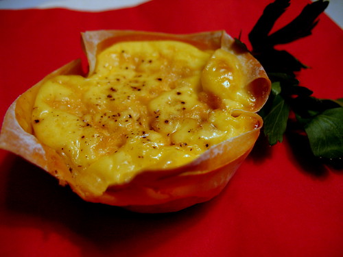 Back to the quiche: while I think the formula of placing wonton skins in a muffin tin and filling it could work for any type of quiche filling, this time around I recycled a pleasing combination I made once involving carmelized onion and Feta. I think it surprised most guests, who expected to see green veggies rather than brown ones inside their quiche. I guess once you stray from first expectations, there can be no looking back sometimes. Call this what you may, a small quiche, small egg tart or neither of the above, or the recognizable. Hopefully it’s just not small-minded.