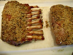 Happy day after Easter, everyone. This recipe may be a day late, but as you’ll see later on in the Cost Calculator, not lacking in dollar value. Admittedly, the most important Christian holiday has little significance for me other than being a time to see my family, and together obsess over having something really nice to eat. (Is that so sacrilegious?) The fruit of this year’s obsessions was a nice rack of lamb, French trimmed by the butcher, and simply roasted.