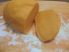 A series of unfortunate events occurred during the making of this unlikely dinner special (which is only natural, since I was preparing it for a room full of hungry people instead of just myself). First, the half-and-half in my refrigerator had soured to a disgusting goop — thank goodness for late-night bodegas. Then, the pasta-like noodle sheets I’d planned on using were likewise rotten and bluish. So much for checking inventory beforehand. I’m actually glad that the latter error forced me to turn to the only other option in sight — mixing, kneading and hand-cranking out fresh lasagna sheets from a couple of eggs and a cup of flour. (I’ve said it before and have to say, once again, that cooking at home can be a good way to get a workout.) Once this fresh pasta was baked into the egg casserole and served up in squares, it had absorbed the dish’s flavors and grown to chubby, flaccid layers soft enough to cut through like cake.