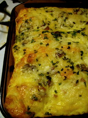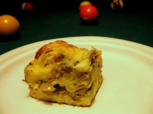 What do breakfast, lasagna, free pool tables and cheap pints of beer have to do with one another? Nothing. Except that they’re sloshing around inside of me as I write this (the free pool more figuratively, say an X-ray glimpse into my stomach with sound effects) a few short hours and not enough sleep after indulging in all. I trust that you could skip the last two items in that equation and have yourself a mighty fine meal out of breakfast lasagna, however. And unlike my last recipe, this one should give you plenty of time to plan ahead for a savory weekend brunch. Or is it dinner?