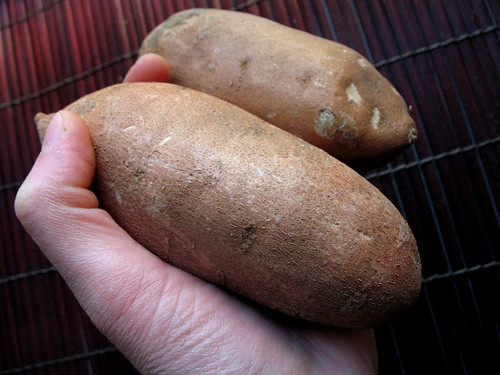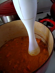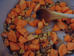 The weekends are a good time to make a pot of soup. You can let it simmer to no end, and the heated leftovers are just as well as if it had been made that day. To further simplify not eating out, this weekend and hopefully a couple of days into the week, there’s few other ingredients needed when you’ve got something starchy and flavorful like a sweet potato.