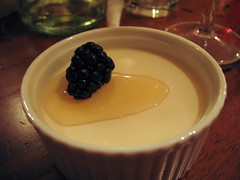 Panna cotta with honey and yogurt. Sweet and sour perfectly harmonized. Conversation-stopping deliciousness, until the discussion turned to how and when we were going to handle eating the blackberry on top — wait until the end? Burst its dark juices all over the cream? To each, his own. (I couldn’t wait.)