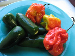 My hands are dangerous instruments of Scotch Bonnet fire, which I can taste and feel. (Especially when trying to put in my contacts in with the help of tweezers — funny, this isn’t the first time I’ve had the peppery problem.) I just washed the cutting board I’d used and got a fresh burst of sting. I better throw that thing out, stained as it is with the virile pepper’s juices. I ought to wipe off this keyboard once I’m done writing this.