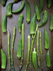 Meanwhile, preheat oven to 450 degrees. Snap off any tough ends of the asparagus and arrange flat on a cookie sheet or roasting pan along with the whole, washed okra pods, if using. Roast for 3-4 minutes, then stir up the vegetables with a pair of tongs. Roast another 2-3 minutes. Remove from heat and let cool.