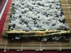 For asparagus rolls: depending on how thick your asparagus are, arrange a few stalks about a half-inch away from one end of the nori sheet, on top of the rice.
