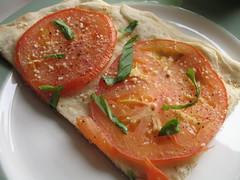 Food this fresh and flavorful needs little, if any, real cooking. I came across a pile of “beefsteak” tomatoes at a packed stand in the Greenmarket and decided on this principle on the spot. With a name like that, who needs actual meat? I can’t figure out how the term was coined, but I’ll bet it was invented by hardcore vegetarians on a streak of natural endorphins. The thick slices cook to a sauce-like consistency in a hot oven for fifteen minutes, placed atop raw pizza bread dough. I smeared the dough first with a crushed garlic and salt mixture to give it some pungency and topped the tomato slices with salt, pepper and a dash of grated Parmesan. It smelled like a pizza parlor while it cooked. Out of the oven, and after cooling for a bit, some freshly sliced basil went on top. Who needs marinara?