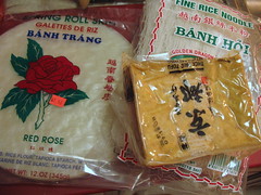 the goods: round rice wrappers, thin rice noodles and fried tofu