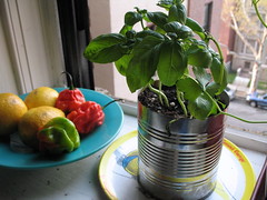 Hi Kate: Just added a photo of my windowsill basil plant, in its lowly coffee can “planter.” (I really need to get real planters, but so far, so good.) I’ve added chives and Italian parsley to this windowsill, and they seem to get enough sun. For dressings, I just added a few recipes above, but I recommend trying out any number of variations once you have the basic vinaigrette technique down (vinegar or sour citrus juice whisked while drizzling in oil until emulsified). And it’s not really dressing, but I also included a recipe for aioli, which I’ve been making to put in just about everything lately.