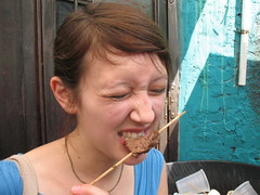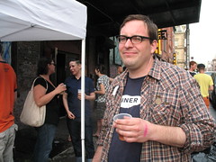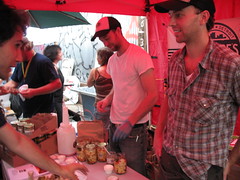 More VIP encounters included Zach Brooks, who writes Midtown Lunch but frequents Brooklyn foodie community events, Erin Zimmer, a staff blogger at Serious Eats (read her write-up here), and finally, Tom Mylan, presiding genius of Unfanciness himself (read about Tom’s vision for the Unfancy Food Show here). Tom was quick to apologize for not putting up good enough tents over the stands, but I thought the constant drips added to the show’s (anti?)-allure. The better it to rain cats and dogs and pigs and rabbits — yes, a live rabbit appeared on a table at some point late in the show that I heard a rumor going around was going to be devoured the same evening by these folks — for true, unrestrained unfanciness. Plus, the day was so hot and muggy that I was drenched in sweat before I could sink my teeth into a spicy pickle. The showers cooled everyone off a bit, and I’d like to think that we all felt sticky, gross, fat, and full together. Hey, we were all shameless carnivores yesterday.