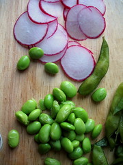 So the final retribution of the story, you see, is Salade Me-coise. Not by-the-book, proper salade nicoise (not that I tend to cook anything by the book), but a confluence of some of its typical ingredients, leftovers, and other things I sort of hold dear. Frozen edamame? I can’t live without them. As I no longer had green beans as I did for the previous day’s version, into the salad these steamed and husked beans went. Radishes and onions were plentiful in my refrigerator, so I gave them a good slice, too. And in place of the olives I’d all but gobbled up, I found an old but still-good container of olive tapenade in my fridge (a relic from a get-together), thinned it out with some vinegar and added fresh chopped herbs for a pungent, chunky dressing.