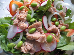 Four brownie points: Whenever you’re dealing with olives, you’re in Sodium City. But with this salad, instead of getting one big bite of it at a time and with other bites zip, you have an even distribution of salt, which led me to not add any extra salt anywhere else in the recipe. I figure I used less total olives than the previous version, hence less salt. Edamame is a great source of protein, fiber and many other nutrients for few calories and sodium; oil-packed tuna, however, is much fattier and saltier though it yields valuable omega-3 and omega-6 fatty acids to help combat heart disease (mercury content notwithstanding).