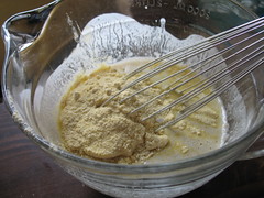 There aren’t too many foods that define American cooking like cornbread. And for all its long history, it’s varied little. I enjoyed the Homesick Texan’s ode to true, cast iron pan-baked cornbread that crisps at the bottom, and wish that the scope of our cooking preventing us from doing similarly. I wish we’d had the means to brown individual slices in butter on a griddle for a minute, too. Something had to be done with the humdrum recipe, to keep it exciting as well as stay in tune with the not-so-simple offerings throughout the rest of the menu. So we bolstered the batter with fresh mashed banana and swapped out the buttermilk for coconut milk.