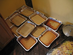 Knowing there had to be a dessert in the mix, myself and the event’s two other esteemed guest chefs, Mike and Mark, had enlisted peaches from the get-go. But details were ambiguous, and changed rapidly. Remembering we were cooking up 300 servings, what was easiest — cake or cobbler? Peaches on top or embedded within? Then there were was the rest of the menu to plan — should bread be served with all that pulled pork, shredded duck and sliced brisket? At one point we settled for serving a wedge of cornbread on the side. After all, it was a southern-style barbecue, and there were barbecue sauces representing each of the Carolinas to sop up. But cornbread would mean more baking, and we were still talking 300 servings each (and three measly chefs with home kitchens). So two nights before the event, the magical idea of this dish was spawned: a cornbread and dessert in one!
