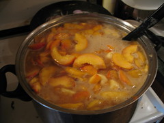 Next, the peaches. An army-sized box of peaches went into a pot for a chunky, fresh-tasting peach compote. Like a pie filling, all it needed was a touch of sugar and fresh lemon juice, and it boiled for half an hour with some water until warm and gooey.