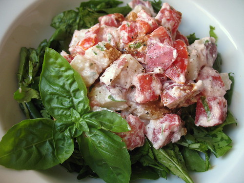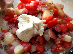I loved the idea of a potato and tomato salad, and whipped one up for my lunch today! I didn’t have any ricotta, so I mixed a small amount olive oil with some red wine vinegar with sage and pepper and used it as my “sauce”. I also added roasted garlic and pine nuts. It’s much more “Italian” tasting, but very very fresh. Thanks so much for the inspiration!