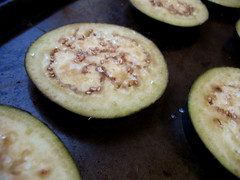 Meanwhile, lower oven to 400 degrees. Squeeze or pat dry eggplant slices of any droplets of liquid that have appeared on top. Brush each side with the olive oil, and sprinkle both sides with a little more salt, some pepper, and half the thyme leaves. Bake for about 20 minutes, or until the centers have become very soft. Remove from pan and set aside.