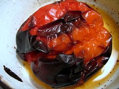 Preheat oven to 500 degrees. Place the red pepper whole in a heatproof dish and bake for about 10 minutes. Flip over with tongs and bake another 5-10 minutes, or until most of the skin has blistered and turned black in parts. Remove from oven and let cool.