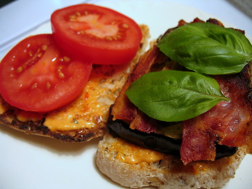 Spread red pepper mayo on both sides of your toast. Layer on the eggplant slices, bacon, lettuce (or basil) and tomato, close sandwich and serve.