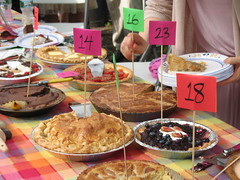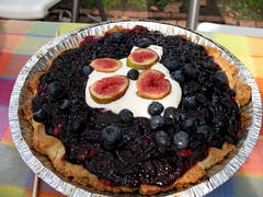 After the tasting session, and some laying around on the grass, the judges stepped onto the stage. They announced the winner of the “Hobo’s Choice” award first; the idea behind this clever title was that the winning pie looked so appealing that a hobo would steal it if it were sitting on a windowsill to cool. I wasn’t surprised when the award went to a blueberry, cream cheese and fig pie, with fresh fig slices arranged in a fan on top. Next, the judges announced “Mom’s Best.” There were a lot of pies that looked like they were the best efforts by Mom on the table, including a creatively adorned apple pie — just the kind Karol had won with last time. But the champion was not to be upset. The award went to the pumpkin-cheese checkerboard “dream” pie! Just as soon as Karol had returned from the stage, they announced the “Most Original” award… and it was my turn to step up. I guess the judges were as pleased with the way my pie turned out as I was. And finally, they announced a new category. Since there were a handful of savory pies on the table this time (unlike last time, when my asparagus pie was the only one), they handed out an award to the tomato tart for best savory pie. For some reason (which I forgot to ask about), we all won a copy of a jazz history book called Delta Blues. A little inspiration for the next Jazz Age-themed pie contest baking session, I suppose.