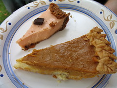 When the judges had finished their tasting, the pies were sliced up for first-come, first-serve sampling by the crowd. Luckily I was poised in the right place at the right time, and picked up a slice each of Karol’s and my pies. If I dare say so myself, these were both polished off pretty quickly. Karol’s pumpkin-cheese checkerboard pie filling was velvety-smooth and every bit as rich and satisfying as a pumpkin pie or cheesecake should be. Only it was combined; and the forces were now indestructibly scrumptious. My watermelon pie was, to my relief, a consistent creamy gelatin texture throughout, and it wasn’t too firm, either. It was just the way I had wanted it to be. I had gone back and forth about decorating the top of the pie with dark chocolate chips, as if watermelon seeds. I finally decided to just go for it — I was aiming for “Most Original” anyway — and I was glad that I did. I think they added a little something special.
