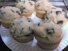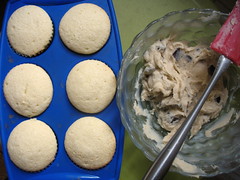 I was talking with someone today who remarked on what he thought to be an uncanny correlation between cupcakes/baking and sex writing, particularly female-written. I can’t remember how we came to this observation, but we soon realized that we both sort of were thinking of Rachel, who is also an accomplished erotica writer. My opinion in this debate would place cupcakes more or less along the lines of chocolate, woman’s natural replacement for sex. (Or at least, that’s what the marketers of Dove chocolate would like us to think.) I don’t really have much else to say to this, but it occurred to me that I got the inspiration for these cupcakes one night a couple days before making them. I was in a sort of bum mood, so I broke out the DVD from the red Netflix envelope that had been sitting on my table for the past week, The Diving Bell and the Butterfly, and popped it in. The moment I got myself situated all nice and snug in front of the screen, I popped back up, as if the couch had springs. Cookies. I wanted to bake myself a tray of chocolate chip cookies. I turned the TV around to face the kitchen as I banged around opening cabinet doors, spilling flour and sugar from their sacks, and whipped up a small helping of six cookies, half-listening to the film in French (and not understanding a word). I had to take down the proportions wildly — the recipe on the back of my package of chocolate chips yielded something like 36. Parsing it down to a mere third, I ended up using one-third of a beaten egg. Nevertheless these questionable calculations, the cookies didn’t turn out too bad. Actually, they were the best I’d had in a while, I thought, as I polished off the last of them before the subtitled movie. Then I fell asleep on the couch. Probably drooling chocolate onto it.