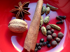 clockwise from bottom left: nutmeg, star anise, cinnamon, green cardamom, cloves, allspice, black pepper