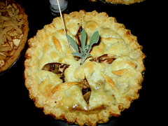 I generally don’t place much emphasis on decoration but because sage leaves have such a distinct, lovely shape I decided to play up this theme on the crust. I first cut four sage-shaped slits in the top crust, and used the cut-out pieces to place on the top. It looked kind of sparse, so I cut a few more leaves from extra dough and decided to affix them asymmetrically, sort of like a scattering of fall leaves. Brushed with cream for golden color and a sprinkle of sugar in the raw, and it was into the oven.