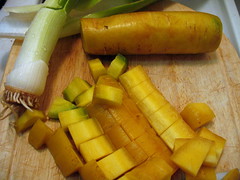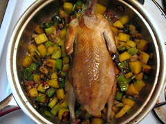 Eight maple leaves (is that a record?): Before you go bashing on the $35 pricetag for the whole pheasant, consider that a restaurant might charge a comparable price for a much smaller serving of it prepared (and that’s not counting the added-value chicken feet appetizer). That said, supporting small farms that raise the birds, and their distributors like D’Artagnan, has a lot of hidden virtues that in theory trickle back to the consumer — raising demand, etc. Aside from the pheasant, there isn’t anything in this recipe that I can’t say isn’t local, natural, and conscientiously grown via the Greenmarket (aside from salt, pepper and a vegetable oil).