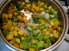 Preheat oven to 374 degrees. Heat the remaining tablespoon of oil and cook the bacon over medium-high heat for 1-2 minutes. Add the carrots, leeks and garlic. Season with salt and pepper and cook, stirring for another minute. Add the water or stock and cover for about 2 minutes. Turn off heat.