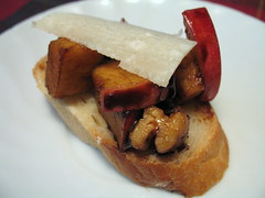 hors d’oeuvre of apple-walnut bruschetta in a balsamic reduction, topped with shaved parmesan