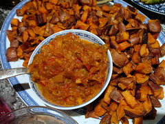 skins-on, roasted sweet potato cubes with a spicy tomato-golden raisin chutney
