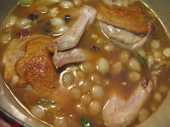 I began by browning the legs on both sides with their skin. The duck I was working with was a whole Pekin duck, which meant that it had wings and everything but the head (the butchered carcass was also not a pretty picture). I decided to toss in the wings and eventually shred what meat could be salvaged from them.
