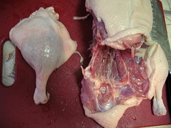 I began by browning the legs on both sides with their skin. The duck I was working with was a whole Pekin duck, which meant that it had wings and everything but the head (the butchered carcass was also not a pretty picture). I decided to toss in the wings and eventually shred what meat could be salvaged from them.