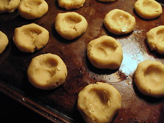 The time-saving trick is to put the berries on the stove while you mix the cookie batter in a bowl. Preheat the oven at the same time. Stir the cranberries every once in a while. Then, once the dough has been rolled into balls and squashed down in the middles with the namesake finger, they’re into the oven and out in fifteen minutes. Make ’em smaller and they’ll be done even faster.