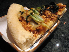 Note on method: since there was pre-cooked chicken around the kitchen (left over from making some stock), I tore the meat into chunky pieces and marinated it like that, instead of raw. After it marinated for about three hours, I shook off the pieces and grilled them on a hot pan for a mere minute or so to a side. I brought the reserved marinating sauce to a boil, stirred in the peanut butter, and used this for the sauce to spread on top of the pizza, followed by the chicken. This worked out fine in the end, and I’m sure that the same method could be done starting with raw chicken cut into small pieces, though you’d need to brown them a little longer than one minute.