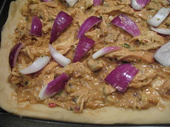 Heat a large sautee pan over medium-high. Remove chicken pieces from the marinade using tongs, and shake off excess liquid. Brown chicken for about 1 minute, turning with tongs once. Set aside in a separate bowl. Reduce heat to medium, and pour the rest of the marinade into the pan. Bring to a boil, stirring. Remove from heat and return to a bowl. Stir in the peanut butter. Taste for seasoning, adding additional soy sauce or sugar as desired. Spread sauce on top of the pizza dough. Add the chicken pieces evenly on top, along with the chopped red onion pieces. Bake at 400 degrees for about 20 minutes, or until crust is lightly browned. Remove from heat, and add cilantro for garnish.