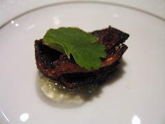 a deep-fried square of Berkshire pig ear with pickled cantaloupe, cilantro and garlic honey (another Harlem/Hawaii dish)