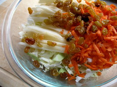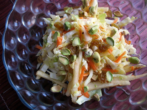 Cabbage, Pear and Pistachio Salad with Golden Raisins and Carrots